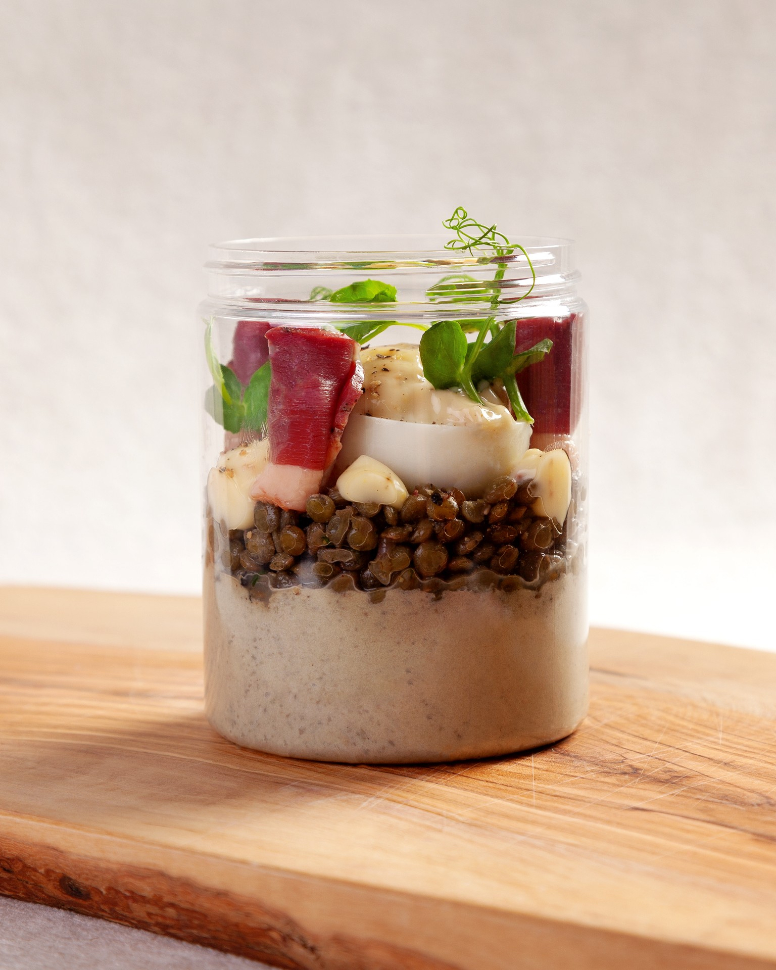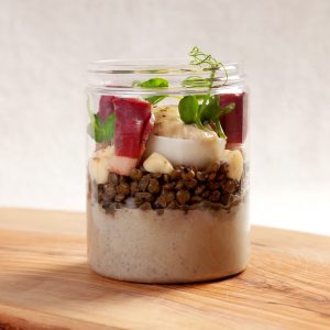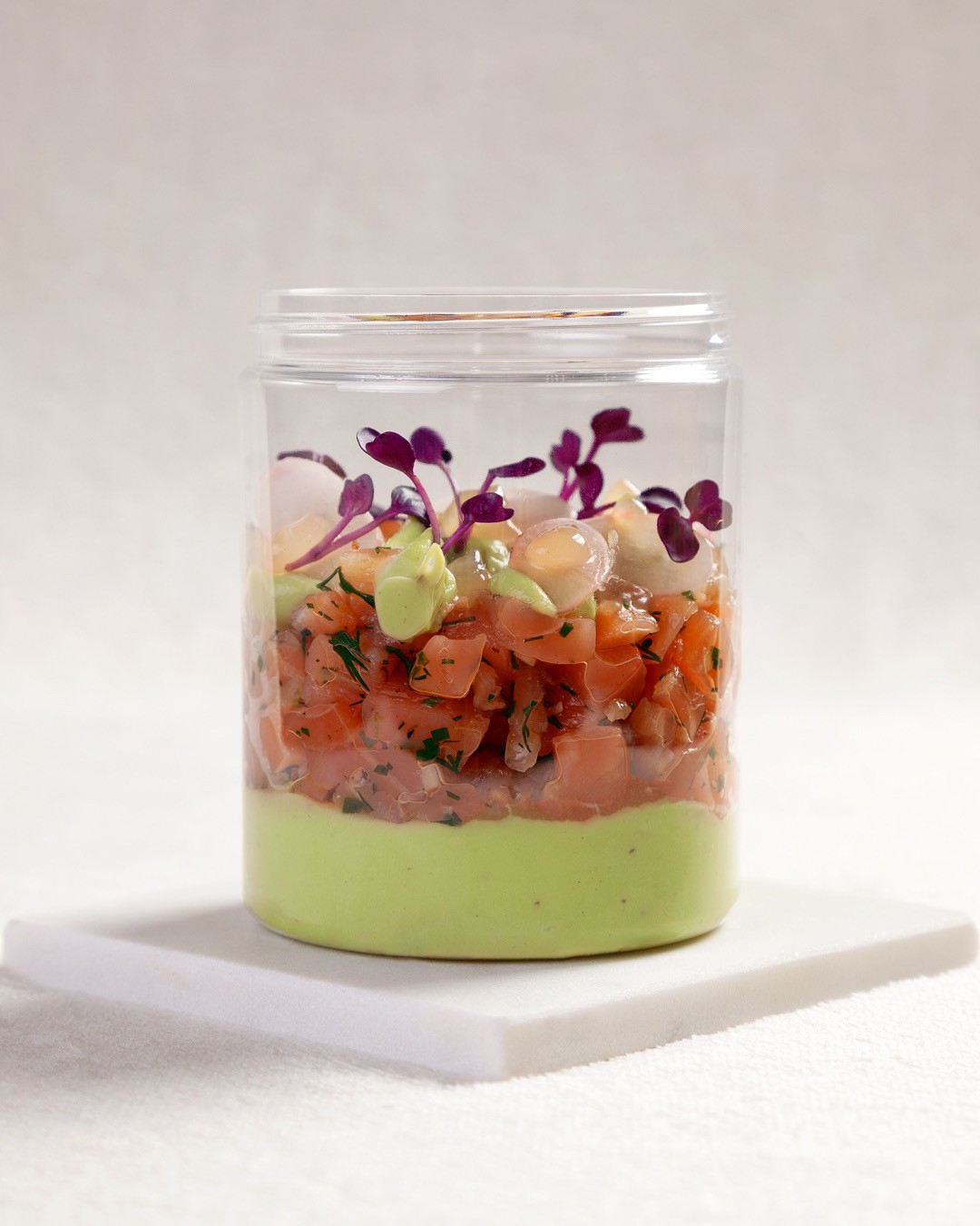 Nous avons trouvé le concept original et innovant dans la mesure où on a l’habitude des mini verrines sur les buffets finger food. Alors que là, il s’agit de grandes verrines individuelles permettant aux convives de découvrir plusieurs saveurs dans le même repas.
